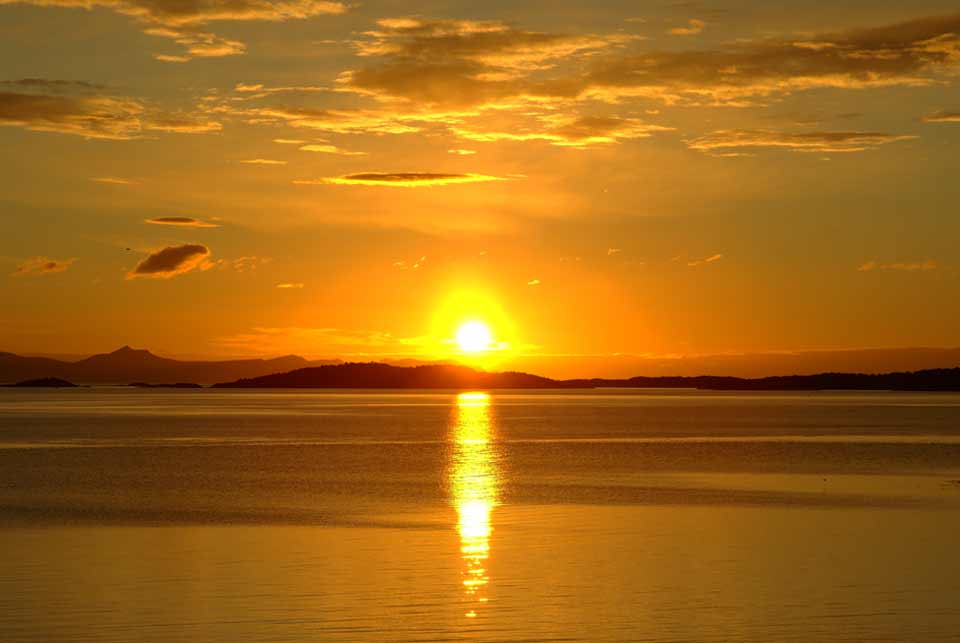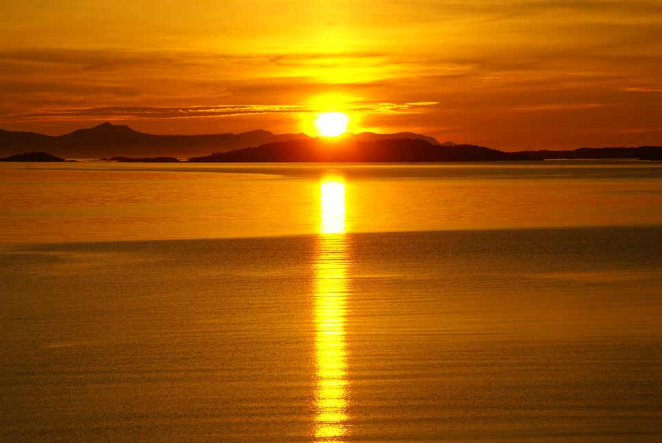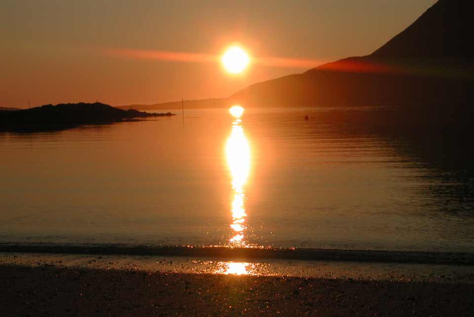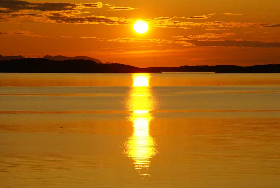From Elgsnes the midnight sun looks especially great since the sunbeams are reflecting from the sea across Toppsundet. On fine midnight sun evenings, many people arrive here to look at the sun and the colors of the sky and the fjord. The midnight sun is above the horizon from May 22nd to July 21st here in Elgsnes, but if you calculate according to summertime instead of when the sun is on it's lowest point, the sun is visible already at midnight on 20th May.